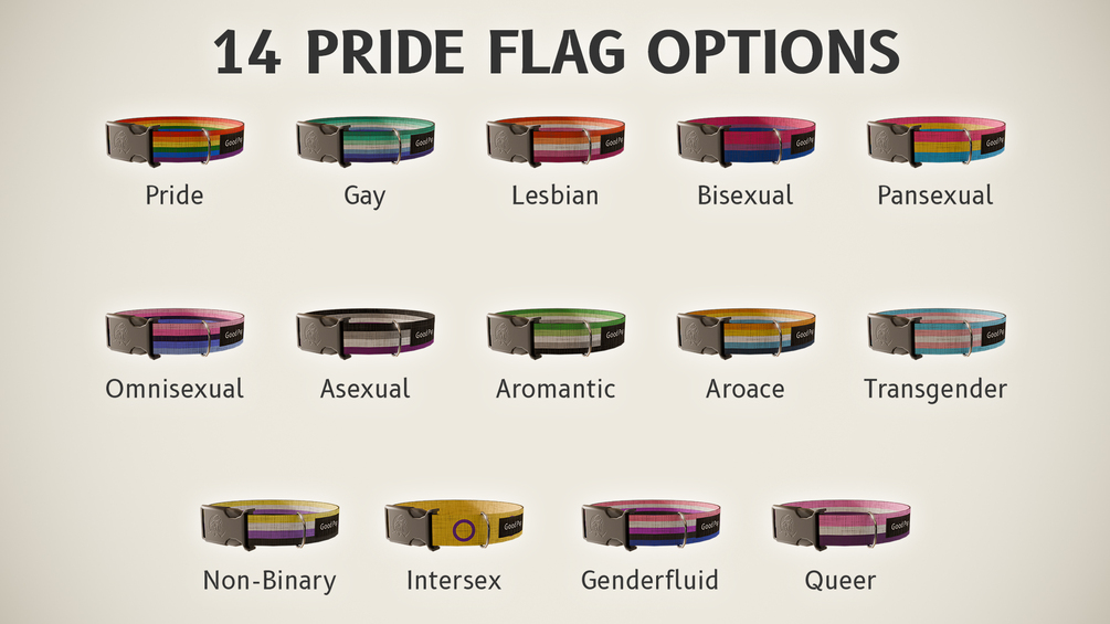 - 14 Pride flag designs: includes Pride, Gay, Lesbian, Bisexual, Pansexual, Omnisexual, Asexual, Aromantic, Aroace, Transgender, Non-Binary, Intersex, Genderfluid and Queer.